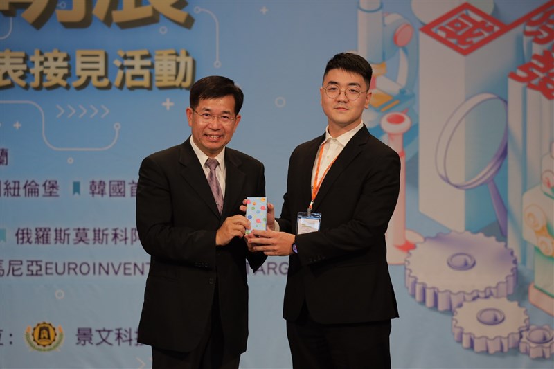 教育部長潘文忠與2022馬來西亞ITEX國際發明展金牌得獎同學陳柏允同學。圖/教育部提供