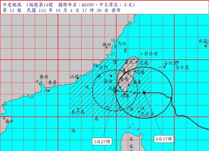 隨著小犬進逼,蘭嶼綠島將先出現強風,台東、恆春半島風雨劇烈,花蓮風雨強勁;北部、宜蘭出現間歇風雨;中南部5日晚間降雨轉趨明顯直到6日白天;澎湖也要留意強陣風,6日逐漸轉雨。