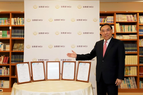法務部說,5個創始機關已完成書面申請、文件審查、書面審查、會議審查、實地審查、證明標章審議等六個階段,法務部上月20日核發標章,標章以代表司法的天秤與代表數位連結符號,構成一個盾牌意象。