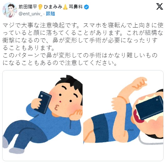 快改掉躺著滑手機習慣 曾有苦主受傷開刀 |2023.10.05 語音朗讀 2020觀看次 字級 大 中 小 日本醫師提醒,在沙發或床上躺著滑手機有風險。圖/美聯社 【本報綜合報導】現代人手機不離身,平常閒來無事,就習慣掏出手機滑一滑打發時間。不過近來有日本醫師提醒,在沙發或床上等「躺著滑手機」這個動作,其實擁有一定程度的風險,弄不好甚至會受傷開刀,需要多加留意。根據日本媒體「まいどなニュース」報導,日本JCHO大阪病院耳鼻咽喉科部長前田陽平,日前在個人twitter上呼籲,表示如果躺著使用手機,有可能會在途中不小心手滑,讓手機砸在臉上,應該盡量避免。醫師警告,躺著使用手機可能讓使用者受傷。圖/擷自前田陽平推特 這種意外其實具有強烈的撞擊力道,嚴重甚至可能導致鼻子變形,需要進行手術治療。除了鼻子以外,過去還發生過因為手機砸到臉,因而產生打斷牙齒、視網膜剝離等傷勢,因此非常危險。底下也有網友分享慘痛經驗,表示「我就是被打到鼻子變形過,還去弄了鼻中矯正術」、「前額有被打到縫了三針過」、「我被打到嘴角好幾次,根本學不乖」、「我就是因為這樣缺了牙齒」、「我花了好幾萬處理傷勢」。其他網友看到則表示「這太恐怖了吧」、「原來連牙齒都會打斷」、「真的該小心了」、「比想像中的還嚴重」、「其實真的滿容易掉下來的」。 前一篇文章 小犬颱風中心掠過恆春 嘉南地區強風造成停電 下一篇文章 日本啟動第二輪福島核汙水排放 預計排放7800噸 熱門新聞 01【閃文集】 駝峰天使2025.11.0402【墨香流韻】一筆清香 一念無塵 梅適情2025.11.0203台中新社花海 重現經典卡通2025.11.0604南天寺30周年口述歷史 登英國期刊專欄2025.11.0305十方禪林40周年 教界高僧大德同賀2025.11.0306【修行在人間】佛心的慈視62025.11.0207旅人心靈寶典《365日》 贈台中通豪大飯店 2025.11.0308看見 電子 穿牆而過 2025.11.0309【綠手指筆記】小花犀角 見證防疫小確幸2025.11.0210【佛教管理學②】禪門的管理法⑥2025.11.02 訂閱電子報 台北市 天氣預報 台灣一週天氣預報 相關報導 【星雲大師如是說】處事禪心【星雲大師如是說】人間佛教【星雲大師如是說】正信之美【星雲大師如是說】輪轉相繼【星雲大師如是說】有情的層次【星雲大師如是說】六忍歌