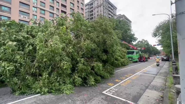 從監視畫面,可以看到路樹一棵棵如骨牌般依序傾倒,當時還有汽機車在停等紅燈,所幸都虛驚一場,未造成車輛損害及人員傷亡。