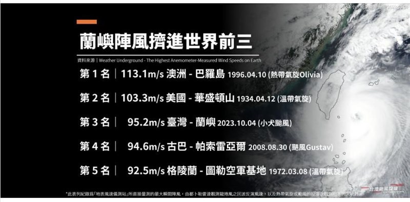 小犬強陣風擠進世界第三 數字952成驚人巧合 |2023.10.06 語音朗讀 811觀看次 字級 大 中 小 小犬颱風前天深夜在蘭嶼帶來17級以上強陣風,風力達每秒95.2公尺,不僅吹壞蘭嶼氣象站風速計,更刷新台灣氣象史126年來最大陣風觀測紀錄。圖/unsplash 【本報台北訊】小犬颱風在蘭嶼帶來17級以上強陣風,風力達每秒95.2公尺,不僅吹壞蘭嶼氣象站風速計,更刷新台灣氣象史126年來最大陣風觀測紀錄。氣象粉專「台灣颱風論壇|天氣特急」6日指出,蘭嶼的陣風紀錄95.2m/s,不只刷新了台灣氣象史上最強陣風紀錄,同時也擠進了世界氣象觀測史上的第三名。「台灣颱風論壇|天氣特急」也指出,另外的數字巧合,蘭嶼測得95.2m/s,恰巧也是晚上9:52,而蘭嶼的郵遞區號也是952。「台灣颱風論壇|天氣特急」指出,蘭嶼風力達每秒95.2公尺,次於1996年熱帶氣旋Olivia於澳洲巴羅島創下113.1m/s (407km/hr)以及1934年溫帶氣旋於美國華盛頓山錄得103.3m/s (372km/hr),凸顯蘭嶼的風速多麼極端。蘭嶼陣風紀錄95.2m/s,不只刷新了台灣氣象史上最強陣風紀錄,同時也擠進了世界氣象觀測史上的第三名。圖/氣象粉專「台灣颱風論壇|天氣特急」「台灣颱風論壇|天氣特急」指出,另外再攤開世界最大陣風排行第6到11名,第6名91.0m/s 日本 - 富士山(1966.9.25 艾達颱風)、第7名89.8m/s 台灣 - 蘭嶼(1984.7.3 亞力士颱風)、第8名89.2m/s 美國 - 加農山(1973.4.2溫帶氣旋)、第8名89.2m/s 美國 - 沃德山(2017.2.20 溫帶氣旋)、第10名89.0m/s 加勒比 - 聖巴特島(2017.2.20 颶風艾瑪)。第11名85.3m/s 台灣 - 蘭嶼(1995.9.22 賴恩颱風)、第11名85.3m/s 日本 - 宮古島(1966.9.5寇拉颱風),光是前11名蘭嶼就包辦了三個名額,顯示這裡的氣候條件真的相當特殊。「台灣颱風論壇|天氣特急」也指出,另外的數字巧合,蘭嶼測得95.2m/s,恰巧也是晚上9:52,而蘭嶼的郵遞區號也是952。颱風小犬過境,4日晚上蘭嶼氣象站測得陣風每秒95.2公尺,超過17級陣風;台東氣象站表示,破了台灣126年紀錄,風速計也吹壞。圖/蘭嶼氣象站提供 前一篇文章 新聞千里眼 下一篇文章 貓狗純素飲食 加入救地球行列 熱門新聞 01南華大學茶禪雅集 靜坐書寫時光膠囊2026.03.2602星雲大師靈骨分燈歐洲 傳燈萬方2026.03.2603佛光山365日越文版 贈西貢日航大酒店2026.03.2704【詩】白花鬼2026.03.2505紅綠葡萄抗氧化抗發炎 連皮吃獲取健康全效益2026.03.2706台灣工藝3專書 呈現文化獨特樣貌2026.03.2707兒童節禮物 新北學生自己票選2026.03.2608中職37年 明大巨蛋開幕戰2026.03.2709北京中學老師 精準預言美伊開戰2026.03.2610伊朗設安全走廊 陸船復航荷莫茲2026.03.25 訂閱電子報 台北市 天氣預報 台灣一週天氣預報 相關報導 宜蘭綠博會 探索真理乾旱嚴峻 雲林古坑春茶產量腰斬中職開幕戰 猿隊險勝兄弟佛光山月光寺啟用 花蓮心靈新地標雲林最炫兒童節 孩童搭乘熱氣球長照3.0增「互助喘息」 用服務換照顧