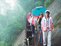 雖然天公不做美,五指山區天亮時即細雨紛飛,登山民眾只能撐雨傘、穿雨衣健行;楊文國說,即使如此,大家也沒忘記撿拾沿途垃圾。