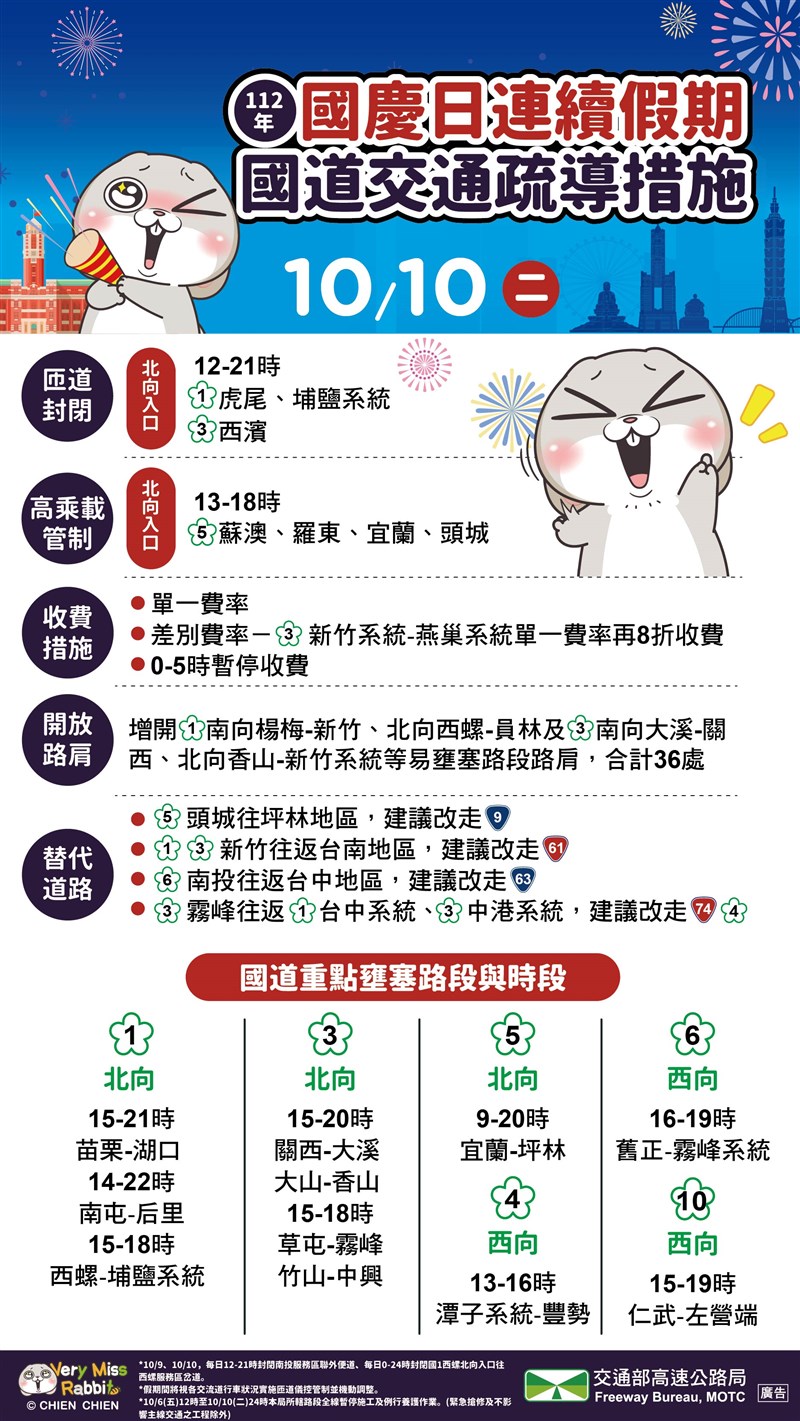 明日迎來國慶收假 高公局估重點壅塞路段出爐 |2023.10.09 語音朗讀 383觀看次 字級 大 中 小 明天是雙十連假收假日,交通部高速公路局預判重點壅塞路段。圖/陳正興2023國慶連續假期國道交通疏導措施。圖/高公局提供 【本報台北訊】明天是國慶連假收假日,交通部高速公路局預判11個重點壅塞路段,建議西部國道北向用路人,南部地區於9時前出發,中部地區於12時前出發;國5北向用路人建議於9時前出發。高公局研判,明日重點壅塞路段包含國1北向西螺-埔鹽系統、南屯-后里、苗栗-湖口;國3北向竹山-中興、草屯-霧峰、大山-香山、關西-大溪;國5北向宜蘭-坪林;國4西向潭子系統-豐勢;國6西向舊正-霧峰系統;國10西向仁武-左營端。高公局表示,明天國道相關疏導措施包括中午12時至晚間9時封閉國1虎尾、埔鹽系統及國3西濱北向入口匝道、下午1至6時國5蘇澳、羅東、宜蘭及頭城的北向入口高乘載管制、單一費率、0至5時暫停收費、開放路肩、替代道路、匝道儀控等。另外,明天國慶焰火於台中中央公園施放,研判當日將有大量車潮湧入活動會場,預估下午2時起,國1台中都會區路段即可能有車多壅塞情形,並持續至晚間10時,建議國慶日下午非前往台中地區用路人,可改道國3、台61或提前出發。高公局表示,預估明天國道交通量為108百萬車公里,為平日年平均(90百萬車公里)1.2倍,其中北向交通量可達60百萬車公里,為平日年平均1.3倍。高公局指出,今日截至下午5時,國道壅塞路段包括國1北向新竹系統至湖口;國3北向關西服務區至大溪;國5北向宜蘭至坪林;國6西向東草屯至霧峰系統,其餘路段行車大致順暢;至下午5時國道交通量為72.7百萬車公里,預估全日交通量為115百萬車公里。2023國慶連續假期國道交通疏導措施。圖/高公局提供 前一篇文章 曾文水庫重登滿水位 明年農作物可望供水無虞 下一篇文章 嘉義溪口鵪鶉場染H5N1禽流感 撲殺3.5萬隻鵪鶉 熱門新聞 01【閃文集】 駝峰天使2025.11.0402台中新社花海 重現經典卡通2025.11.0603南天寺30周年口述歷史 登英國期刊專欄2025.11.0304十方禪林40周年 教界高僧大德同賀2025.11.0305旅人心靈寶典《365日》 贈台中通豪大飯店 2025.11.0306一針一線60載 林全誠繡出神韻人生2025.11.0307看見 電子 穿牆而過 2025.11.0308【傾聽你我他】別為金錢傷感情2025.11.0309【觀我望己】 追日,散策旅程(上)2025.11.0310【民俗資產】 山林守護者:阿里山受鎮宮2025.11.03 訂閱電子報 台北市 天氣預報 台灣一週天氣預報 相關報導 興達電廠 應變演練澎湖馬祖包機 空中交通創舉中興新村活化 省主席官邸變身餐廳翡翠水庫支援發電 台電須付補償費林信義:台灣於APEC能見度提升國軍裝備採購 證實5案延宕