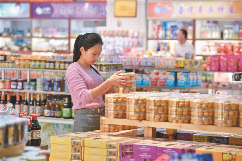 中國大陸商務部昨日公告,對台灣貿易壁壘調查延長3個月,延至2024年1月12日止。圖為福建自貿區的台灣商品。圖/新華社