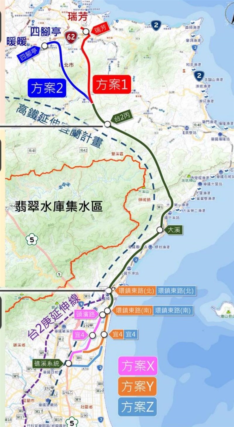交通部公路總局進行「台62線瑞濱延伸至宜蘭可行性評估」進入期末規劃,今天公總在簡報中指出,路線起點段台62的瑞芳、四腳亭(1、2)方案;終點段頭城至國5礁溪(X、Y、Z)方案,6種組合路線中以1Y最適合,經費約2千億元。