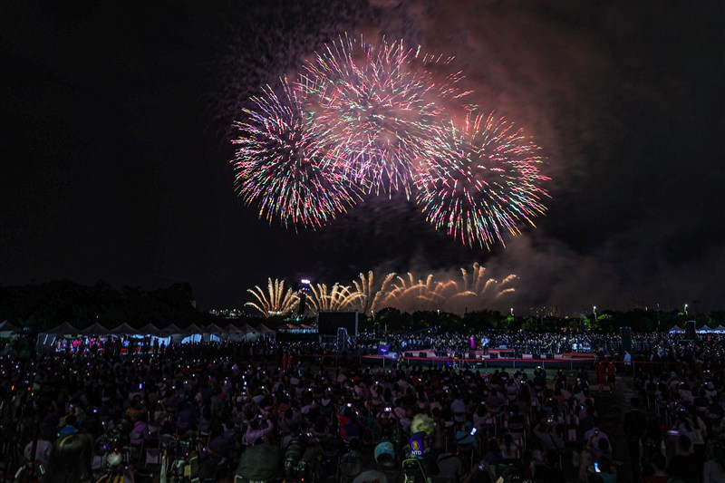 國慶煙火的無人機隊展演,僅出現一個「雙十圖案」之後就取消,台中市政府表示,主要是因為國慶當天有20架無人機入侵造成訊號干擾,基於維安考量,被迫取消。圖/黃仲裕