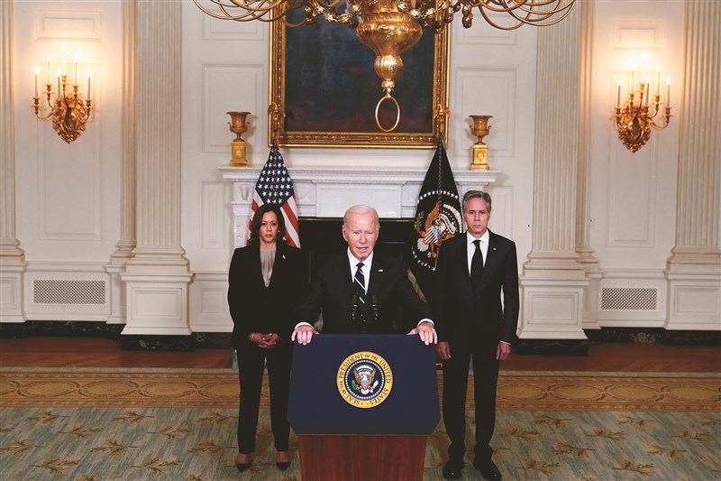 拜登(中)十日表態支持以色列,同時派出國務卿布林肯(右)到以色列協助。左為副總統賀錦麗。圖/美聯社