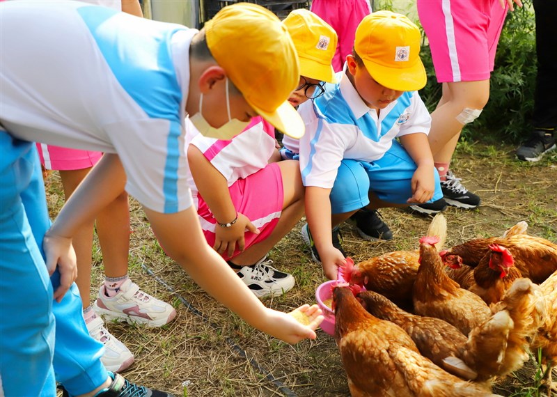 興嘉國小學童進入嘉義大學新民溫室體驗餵雞。圖∕嘉義大學提供