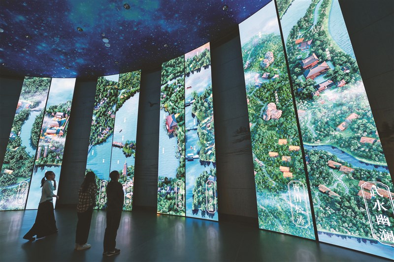 中國大陸浙江省嘉興市南湖區的「大運河數字詩路e站南湖體驗中心」,以實體場景和數位平台同步建設推進的方式,融入文字、影像、VR、全息投影等新媒體技術,透過主題展區和互動功能區,多方位展示大運河嘉興段沿線詩詞、景點、歷史遺存和非遺文化等資源,生動呈現出江南運河的人文底蘊,是運河文化產業集聚和文化藝術溝通交流的平台,吸引市民遊客前來參觀體驗。圖/新華社