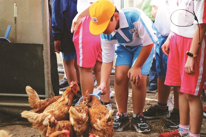 興嘉國小學童,進入嘉義大學溫室體驗餵雞。圖/中央社