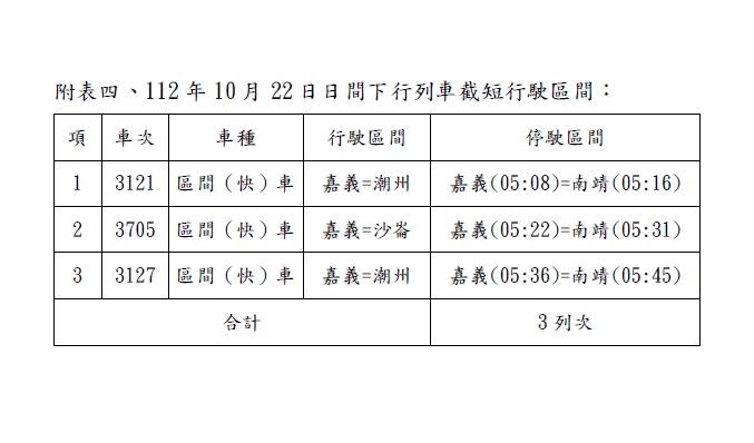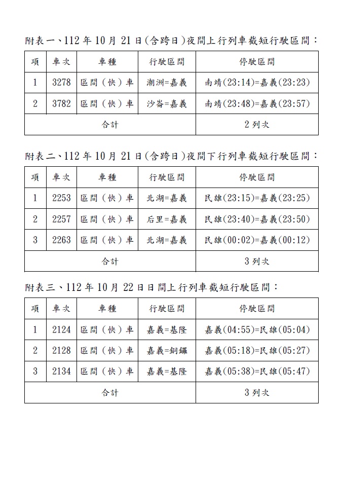 嘉義市區鐵路高架化施工 21、22日截短行駛11列次 吳亭頤 |2023.10.13 語音朗讀 487觀看次 字級 大 中 小 台鐵局表示,「拆除119道岔改鋪曲線軌道工程」作業將影響「民雄站」至「南靖站」區間部分旅客列車,預計10月21日夜間列車及22日日間將截短行駛11列車次。圖/資料照片 【記者吳亭頤台北報導】台灣鐵路管理局表示,為因應政府「前瞻基礎建設計畫」之軌道建設及消除嘉義市區鐵路沿線兩側地區發展阻隔,提升土地整體利用、均衡都市發展,10月21日跨次日配合鐵道局辦理「拆除119道岔改鋪曲線軌道工程」作業,將影響「民雄站」至「南靖站」區間部分旅客列車。台鐵局表示,因應「嘉義市區鐵路高架化計畫」,預計將截短行駛11列車次,時間為10月21日夜間列車及22日日間列車;另施工期間,部分旅客列車將延誤運轉,請旅客見諒並多注意車站播音。台鐵局於10月21日跨次日配合鐵道局辦理「拆除119道岔改鋪曲線軌道工程」作業。圖/台鐵局提供台鐵局於10月21日跨次日配合鐵道局辦理「拆除119道岔改鋪曲線軌道工程」作業。圖/台鐵局提供 前一篇文章 文湖線11日列車延誤 2023年已出包19次 下一篇文章 星雲大師:無的功用 熱門新聞 01WTA、ATP年終賽 獎金創新高2025.11.0702健保補充保費變革 政院急踩煞車2025.11.0703補充纖維、鈣、鎂、鉀 預防多種疾病風險2025.11.1104再闖WTA年終賽 謝淑薇力拚第2冠2025.11.0705【寬鼎畫語】 看不見的真相2025.11.1006【詩】再現綠川2025.11.0707佛光山大學校長論壇 盼教育融入佛法2025.11.0808【樹博士系列】土壤的祕密XV 水稻田減排新觀念IV 土地的溫柔革命 雲林大埤寫益生菌奇蹟2025.11.0909佛光山深耕紐西蘭 毛利族傳統禮致謝2025.11.0710星雲大師全集【傳記】百年佛緣─生活篇 我的衣食住行 5-52025.11.07 訂閱電子報 台北市 天氣預報 台灣一週天氣預報 相關報導 修舊如舊 瑞三礦業整煤廠再生通霄電廠閃鳳凰 大煙囪「放倒」台近7成員工薪資 低於平均訪歐返台 蕭美琴:處境艱難不退縮魏哲家:黃仁勳來要更多晶片興達電廠 應變演練 作者其他文章中斷15年 阿里山林鐵7/6全線通車台鐵加祿站 旅客成長百倍中職統一獅 奪第17座季冠軍莫莫尼:叛逆少年 渴望被聆聽、被理解塞爾蒂克捧第18冠 超越湖人登頂NBA台鐵貨運新車 R200報到