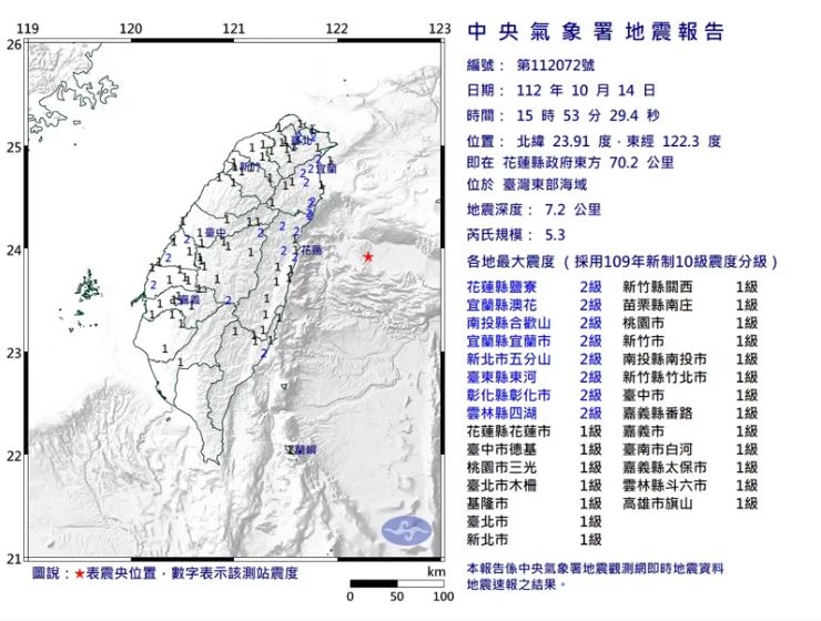 根據中央氣象署最新資訊,今天下午3時53分發生芮氏規模5.3地震,地震深度7.2公里,震央位於花蓮縣政府東方70.2公里的台灣東部海域,花蓮縣、宜蘭縣、南投縣、新北市、台東縣、彰化縣及雲林縣的最大震度為2級。