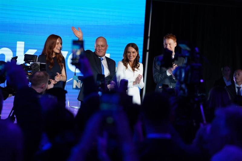 紐西蘭14日舉行國會大選,現任總理希金斯承認敗選,國家黨黨魁盧克森(左2)可望成為新總理。圖/取自facebook.com/christopherluxon