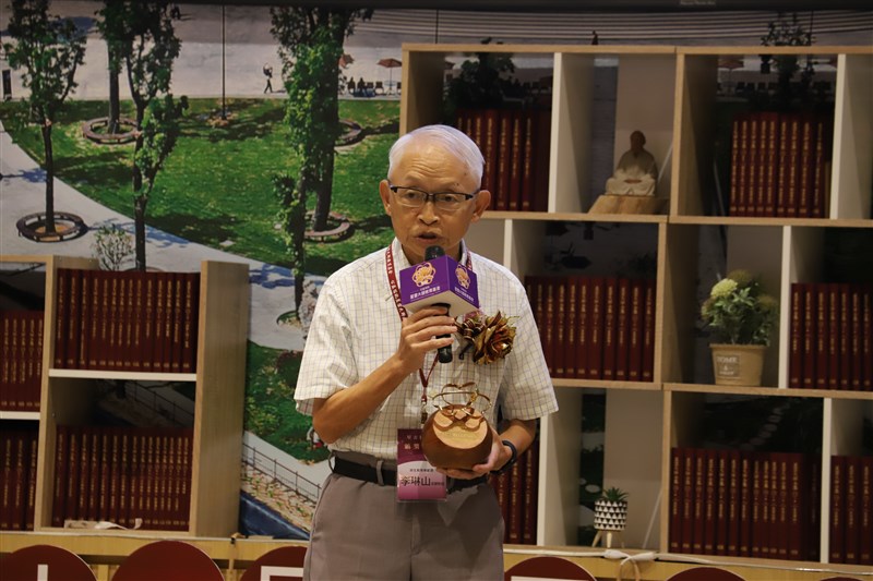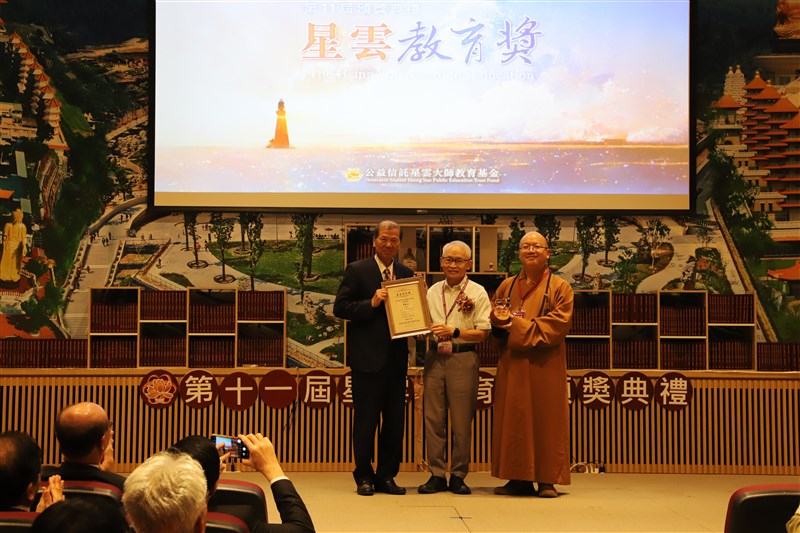 台灣大學名譽教授李琳山獲頒「終身教育奉獻獎」(中)、佛光山住持心保和尚(右)及星雲教育獎指導委員會主委楊朝祥(左)頒獎。圖/人間社記者梁清秩