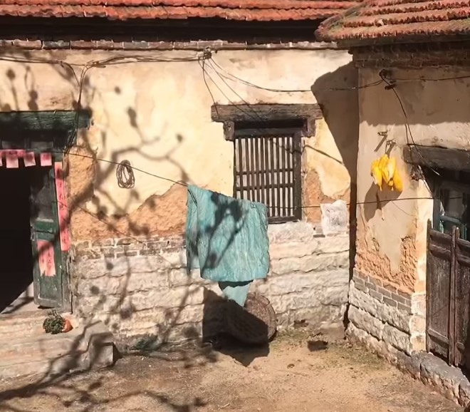 拉起一條簡單晒衣繩,衣服、被單往上一掛就是農家晒衣場景,門口擺著一長矮木凳子,彷彿看見老奶奶坐在上頭製作風乾食品。