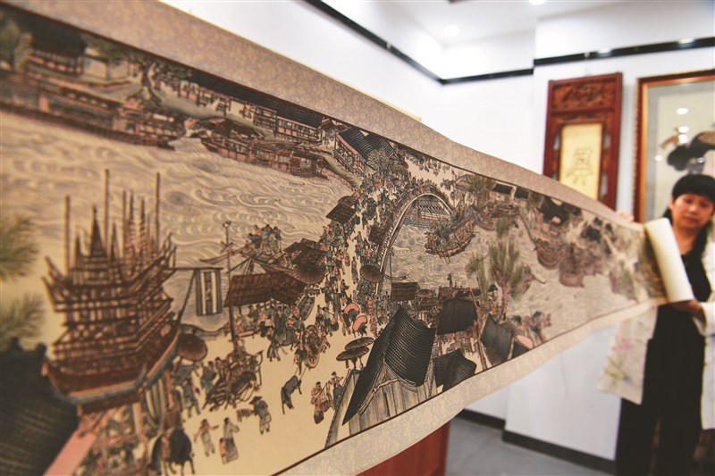 陶永紅展示她創作的10公尺長卷〈清明上河圖〉彩色髮繡。