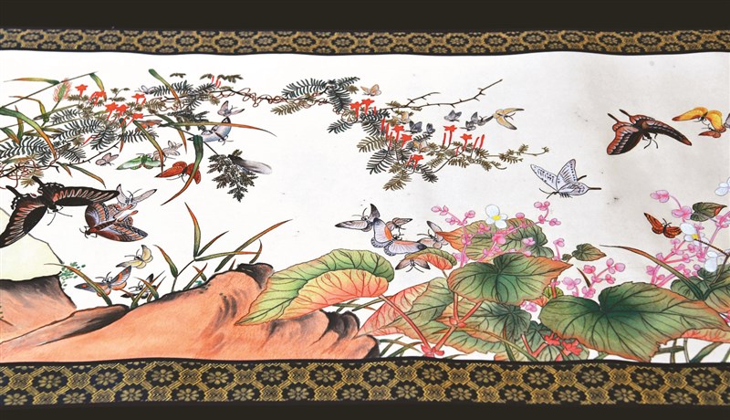 彩色髮繡〈百蝶圖〉特寫,蝴蝶在花草間飛舞。圖/新華社