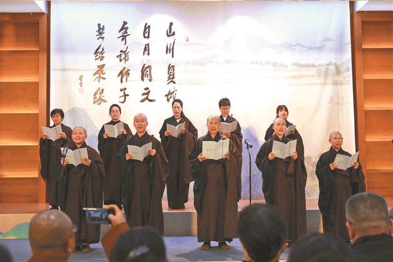 滿蓮法師(前排左三)帶領上海星雲文教館僧信獻唱太虛大師〈五十生日感言〉,也是星雲大師一生的寫照。圖/上海星雲文教館提供
