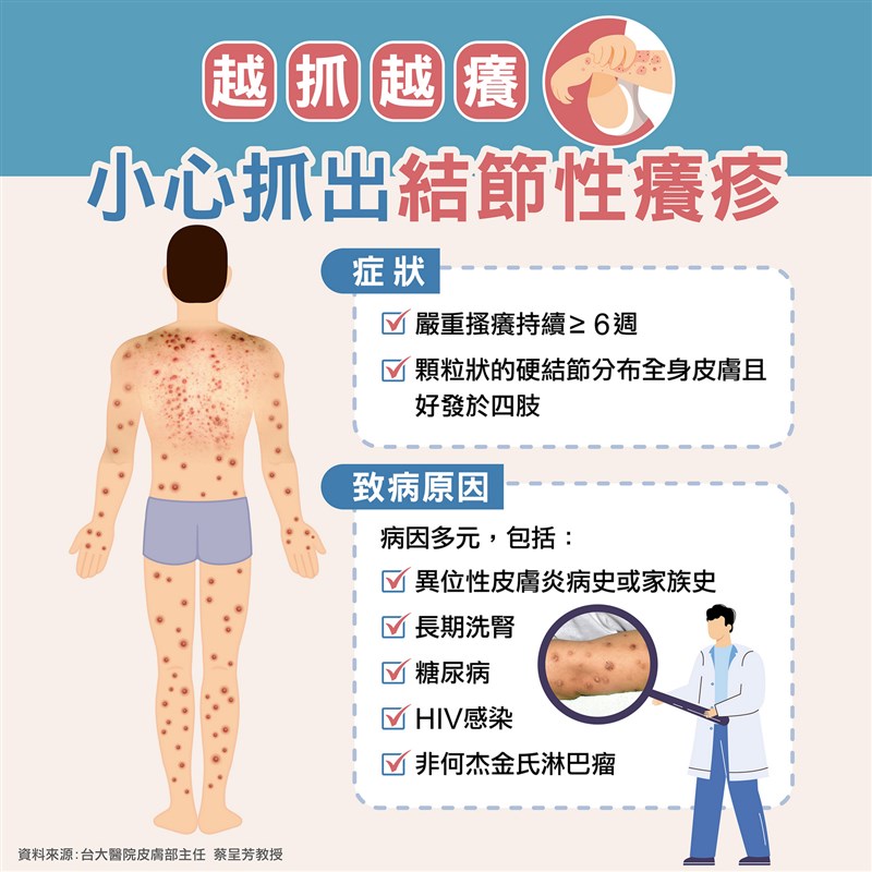 蔡呈芳指出,結節性癢疹是一種慢性皮膚疾病,好發於壯年及中老年人,病灶外觀有明顯較大、偏硬的顆粒狀結節,甚至融合成板塊,引發原因多元,除了部分合併異位性皮膚炎外,多數原因不明。結節性癢疹,也被認為是「罕病」的一種,與民眾單純因為習慣性摳抓、導致一顆顆的癢疹萌生,或是洗腎或糖尿病造成的皮膚搔癢,並不相同。