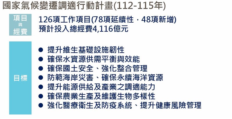 環境部說明,去年邀集16個部會共同檢視歷年調適工作執行情形,並參酌國內外最新氣候變遷科學資訊,提出「國家氣候變遷調適行動計畫(112-115年)」,主要是針對易受衝擊領域,設定七個目標,未來將與各部會每年檢討公開執行成果報告,並滾動修正行動計畫。