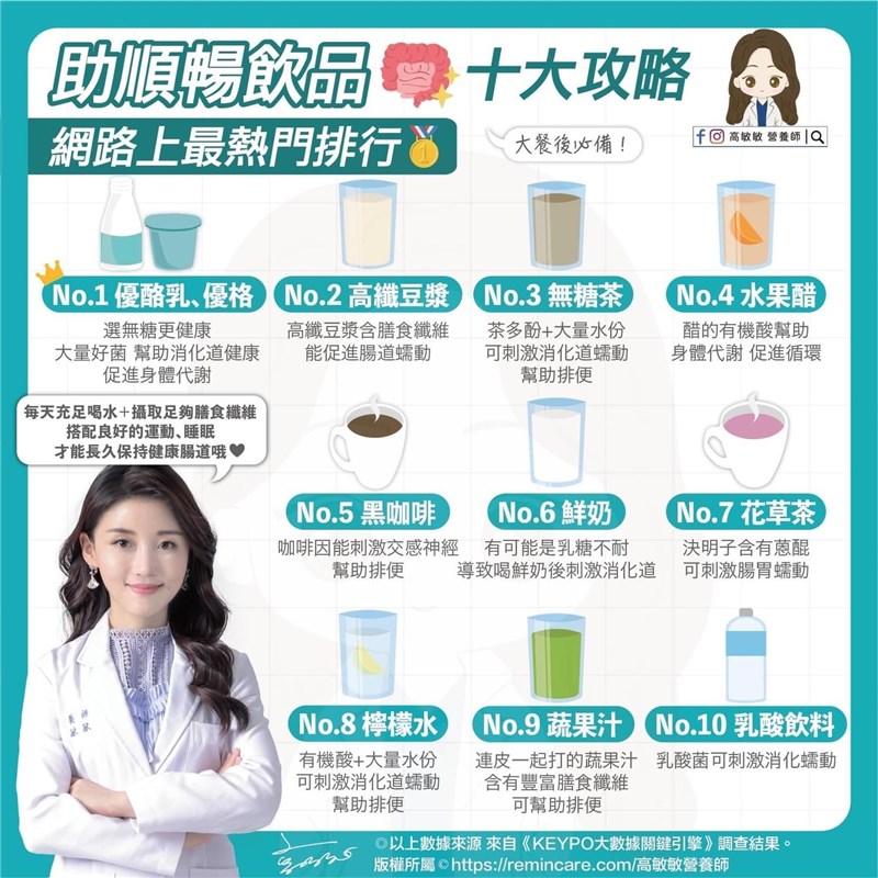 10種順暢飲品 排便力最佳是「它」 陳玲芳 |2023.10.19 語音朗讀 3541觀看次 字級 大 中 小 十種「助順暢」飲品,穩坐第一名冠軍寶座的是「優酪乳(或優格)」。營養師提醒大家,也要每天補充足夠水分,攝取膳食纖維與好油,搭配良好運動與睡眠,常保「腸道健康」。圖/pexels 【記者陳玲芳台北報導】衣食無虞的現代人,常用「吃」來慰勞自己、紓解工作壓力,過度貪圖美食,難免有「胃腸卡卡」的問題。有的人常出現「胃食道逆流」症狀,也有人不知不覺中「便祕」上身。營養師高敏敏引用來自《KEYPO大數據關鍵引擎》調查結果,列舉出以下十種「助順暢」種飲品,包括穩坐第一名冠軍寶座的「優酪乳」;同時,也提醒大家,每天補充足夠水分,加上攝取足夠的膳食纖維與好油,搭配良好的運動習慣與充足睡眠,才是常保「腸道健康」之道。圖/高敏敏營養師提供NO.1 優酪乳(或優格)優酪乳、優格含有大量好菌,能維持腸道中菌相平衡,幫助消化,有助排便順暢。營養師也貼心建議大家,選「無糖」更健康,更能達到促進身體代謝的效果。《延伸閱讀》腸道健康攸關發育 多喝這個是關鍵NO.2 高纖豆漿豆漿有「植物界牛奶」的美譽。豆漿中的膳食纖維,能促進腸道蠕動,更不用說額外添加纖維的高纖豆漿。但是,喝豆漿易脹氣的人,就要注意少量攝取。圖/pexelsNO.3無糖茶綠茶中有茶多酚以及大量水分。可刺激消化道蠕動、幫助排便順暢。但國健署也提醒大家,茶當中含有咖啡因,攝取過多容易使體內水分流失。還是要適量飲用,「以茶代水」就不建議喔!NO.4水果醋醋的有機酸,能幫助身體代謝循環,夏秋之交,想要清涼、消暑又開胃,水果醋是不錯的選擇,但也要注意含糖量的問題,同時最好挑選由天然水果自然發酵的果醋較健康。NO.5黑咖啡許多人習慣用「每天一杯黑咖啡」來開啟元氣滿滿的一天。營養師高敏敏說,她聽過不少人分享「早餐喝完黑咖啡後,排便都超順暢!」她說因為咖啡因能刺激交感神經、幫助排便,但喝完咖啡一定也要多喝水,避免咖啡因攝取過多,會加速體內水分流失。圖/pexelsNO.6 鮮奶不少人喝鮮奶、乳製品會馬上跑廁所,但其實有可能是「乳糖不耐症」,導致喝鮮奶後刺激消化道、無法完全消化乳糖,才會有排氣、腹瀉的症狀。NO.7 花草茶 花草茶經常會添加「決明子」,其實決明子的蒽醌類化合物(如大黃酚)不僅能刺激腸胃蠕動,還有抑制細菌生長的效果,再加上大量的水分,自然有幫助「嗯嗯」(排便)的效果。NO.8 檸檬水檸檬水一直是夏季的熱門飲品,韓星宋慧喬也曾利用「檸檬水清腸法」;檸檬水有順暢功效,是因為含有有機酸、維生素C,有機酸能刺激腸道蠕動,而維生素C能將水分吸入結腸,使腸道收縮,再加上大量水分「助攻」 ,當然可以溫和又清爽的幫助排便。圖/pexelsNO.9 蔬果汁蔬果本身含有大量的膳食纖維,一般人在喝蔬果汁時,都會把較粗的水果皮、蔬菜梗去除,殊不知,連皮一起打的「高纖」蔬果汁效果尤佳,最好能善加利用這些蔬果的纖維質。NO.10乳酸飲料乳酸菌可以維持腸道的健康,刺激消化蠕動,但要注意「市售乳酸飲料」是否添加過多糖分?以免喝完之後,幫助排便是其次,小腹反而多一圈! 前一篇文章 腸道健康攸關發育 多喝這個是關鍵 下一篇文章 換季皮膚乾又癢 飲食3招可改善 熱門新聞 01佛光山在家戒會 海內外戒子行佛2025.10.2702星雲大師全集【經義】佛法滿人間—心能轉境2025.10.2703紐國馬努考東區警局培訓 北島佛光山召開2025.10.2804【小土豆日記】泡麵來襲2025.10.2705跆拳世錦賽 18歲劉侑芸奪金2025.10.2706台北動物園壁畫 展現野性生命力2025.10.2707【台灣媽媽在荷蘭】網路世界 不能有話就說2025.10.2708巨型卡通登維港2025.10.2709中美談妥 貿易協議框架2025.10.2710星光水岸樂園 親子暢快消暑2025.10.27 訂閱電子報 台北市 天氣預報 台灣一週天氣預報 相關報導 伊甸推頤養食 讓長輩吃得美味握力減弱健康警訊 反映身體功能下降勤刷牙反蛀牙? 醫:並非愈用力愈好AI判讀、基因、血液檢測 3技術早期揪出失智症防腸病毒、流感 洗手降25%風險睡眠好常運動穩定代謝 身體不發炎大腦不早衰 作者其他文章伊甸推頤養食 讓長輩吃得美味握力減弱健康警訊 反映身體功能下降AI判讀、基因、血液檢測 3技術早期揪出失智症防腸病毒、流感 洗手降25%風險三好校園共識營 306校推教育向善食安醫師顏宗海 教你打造無毒餐桌