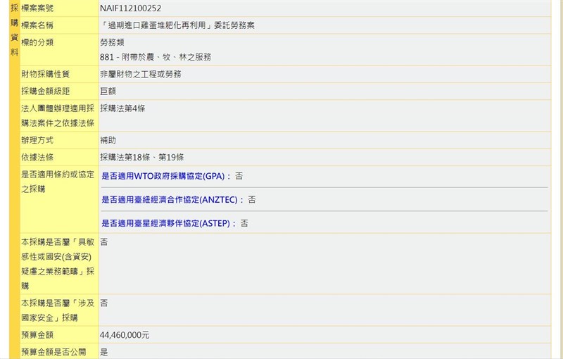 中央畜產會近期公告「過期進口雞蛋堆肥化再利用」委託勞務案,預備銷毀342公斤過期雞蛋,預算4446萬,今天公告,11月13日截標、11月14日開標;履約期限為12月31日;這也是今年政府執行專案進口雞蛋政策以來,首次有相關業務,進行公開招標。圖/取自中央畜產會