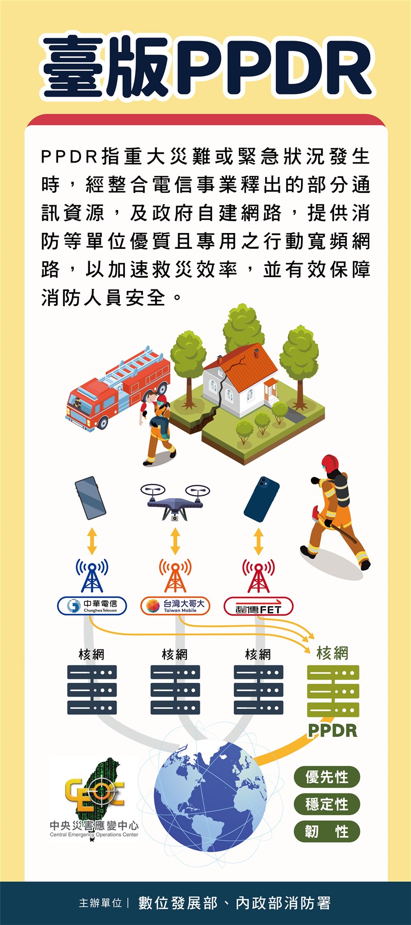 數位部建制「台版PPDR」 確保救災單位優先通訊 吳亭頤 |2023.10.20 語音朗讀 338觀看次 字級 大 中 小 數位部攜手內政部消防署及電信業首次演練救災通訊系統,確保緊急狀況時救災單位優先通訊。圖/數位部提供 【記者吳亭頤台北報導】數位發展部今(20)日與內政部消防署、三大電信業者合作進行首次「公共安全與救難應變(Public Protection and Disaster Relief, PPDR)」通訊系統演練,模擬當緊急狀況發生時,救災單位可藉由多核心網路共用公網技術,優先使用業者持續運作的電信基礎設施,確保救災單位優先通訊。數位部說明,PPDR是一個寬頻通訊架構下的國家公共安全與救難應變通訊系統,目前美國與韓國已有此機制,國際上也有多個國家正在研議或規畫。數位部規畫的台版PPDR,透過政府主導建置核心網路,介接三大電信業者基地台,電信業者協助在重大緊急狀況發生時,將行動網路部分頻寬,劃撥給救災單位進行急難救助使用,救災單位使用特殊SIM卡,確保通訊專用優先。數位部配合內政部消防署於南投縣竹山鎮舉行「112年災害防救科技成果展」活動,進行PPDR小規模演練,由數位部建置PPDR通訊系統,內政部消防署協調台中市政府消防局第七救災救護大隊專責救護隊及台南市政府消防局義交通訊中隊,演練致災強震發生時,透過PPDR通訊使用「遠距醫療」、「無人機勘災」等新興科技,進行災難救助。數位部指出,透過電信業者合作與基地台系統設定,救災單位可於連網壅塞、連網中斷的情況下,使用任一業者未毀損基地台,並享有保障頻寬,具有通訊優先性、穩定性、強韌性,爭取黃金救援時間。為持續精進PPDR通訊系統,數位部提到,目前已規畫於113至114年繼續辦理PPDR通訊系統建置計畫,於地方縣市擇點進行基地台介接,並對當地救災單位進行教育訓練,透過分析多機關使用PPDR網路可行性,研提行動通信PPDR網路部署機制及成本效益分析報告,確保救災單位的優先通訊以強化救災能量。數位部攜手內政部消防署及電信業首次演練救災通訊系統,確保緊急狀況時救災單位優先通訊。圖/數位部提供數位部攜手內政部消防署及電信業首次演練救災通訊系統,確保緊急狀況時救災單位優先通訊。圖/數位部提供 前一篇文章 《星雲法語》溝通四要 下一篇文章 刺激日客來台 觀光署募集「千人遊台灣」玩這7縣市 熱門新聞 01【樹博士系列】土壤的祕密XV 水稻田減排新觀念IV 土地的溫柔革命 雲林大埤寫益生菌奇蹟2025.11.0902【寬鼎畫語】 看不見的真相2025.11.1003悅讀華嚴經 成為幸福安樂地球人2025.11.0904【森活日誌】意外的香遇2025.11.0905【視覺DJ 】給自己按個讚2025.11.0906【朗朗晴空】能替別人著想不會小2025.11.0907星雲大師全集⑲【佛教管理學②】禪門的管理法⑧2025.11.0908發現DNA雙螺旋結構 諾貝爾生醫獎得主 華生97歲辭世2025.11.0909佛光山書蔬展開幕 聚焦天天行三好2025.11.0910阿里山林鐵森里號 躍登國際2025.11.09 訂閱電子報 台北市 天氣預報 台灣一週天氣預報 相關報導 M1A2T將納入國軍指管系統修舊如舊 瑞三礦業整煤廠再生通霄電廠閃鳳凰 大煙囪「放倒」台近7成員工薪資 低於平均訪歐返台 蕭美琴:處境艱難不退縮魏哲家:黃仁勳來要更多晶片 作者其他文章中斷15年 阿里山林鐵7/6全線通車台鐵加祿站 旅客成長百倍中職統一獅 奪第17座季冠軍莫莫尼:叛逆少年 渴望被聆聽、被理解塞爾蒂克捧第18冠 超越湖人登頂NBA台鐵貨運新車 R200報到