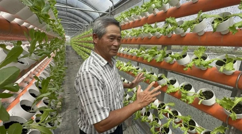 褒忠鄉公所和新湖農場合作成功完成國內最大的魚菜共生系統,農場理事主席陳清山說明開發經過和效益。圖/蔡維斌