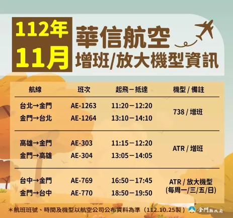 華信航空11月將放大機型,相關航班資訊如圖。圖/華信航空提供經過縣府觀光處與交通部民航局持續溝通協調下,該局已督促航空公司應視旅客需求,透過加班機或放大機型等方式增加運能外,並針對預備運能事先妥善規畫。