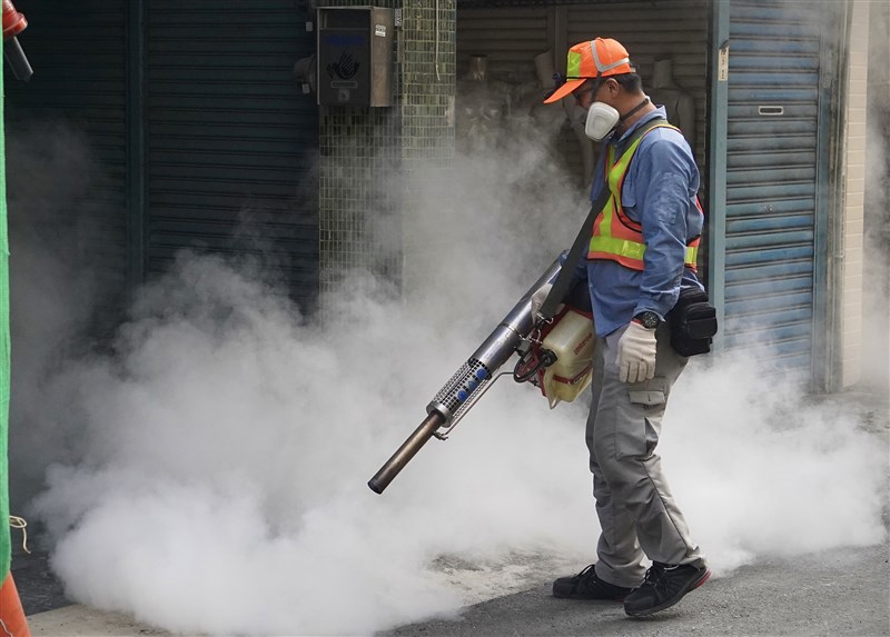 圖為防疫人員24日在高雄市苓雅區噴藥清消,加強防治登革熱。圖/中央社