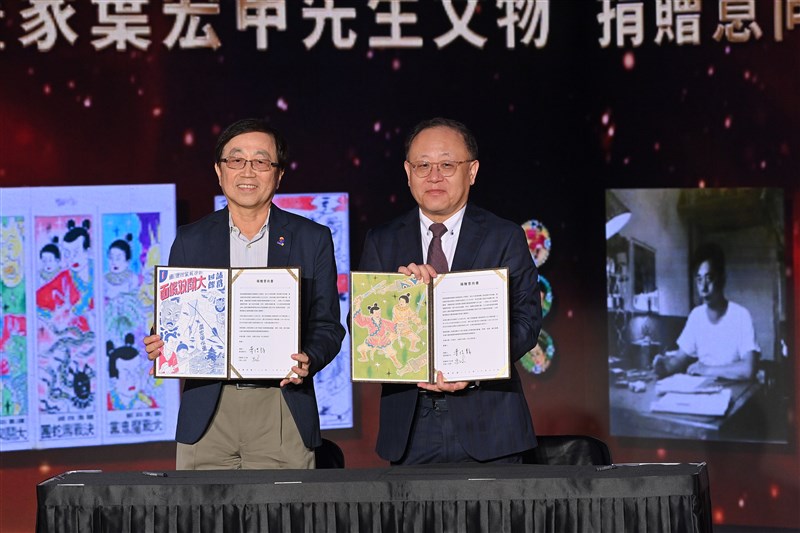在「第14屆金漫獎頒獎典禮」上,葉宏甲之子葉佳龍(左)簽署父經典作品的捐贈意向書,為即將於年底開展的國漫館增添重要館藏,右為文化部長史哲。圖/文化部提供