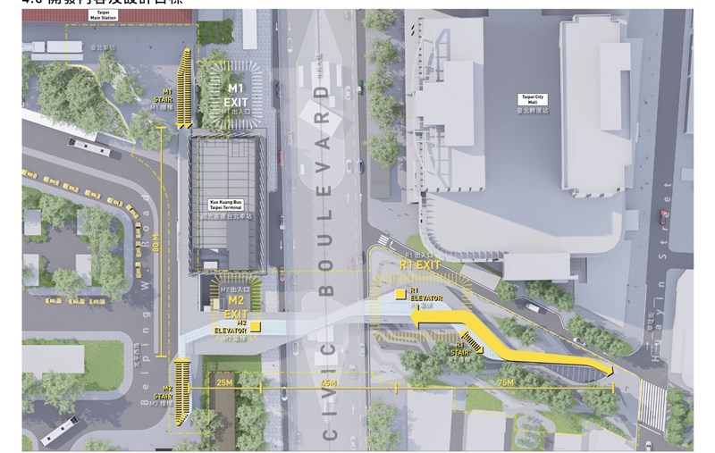 【本報台北訊】台北車站地面層沒有跨越市民大道連結台北車站和線形公園的路線,台北捷運公司規畫在國光客運台北車站旁的市民大道上方興建空廊,供市民大道南北側行人跨越,台北市都市設計審議委員會今再度審議,委員建議空廊玻璃頂蓋可調整材質為具排水、抗汙、遮蔭等功能,全案修正後通過。