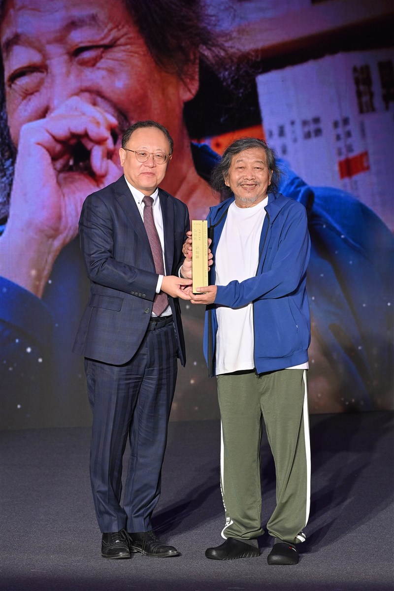 文化部長史哲頒贈第14屆金漫獎「特別貢獻獎」予漫畫家暨漫畫研究者洪德麟(右)。圖/文化部提供