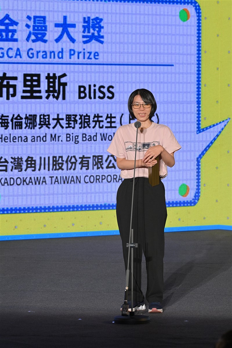 布里斯以《海倫娜與大野狼先生(上、下)》奪得壓軸的「金漫大獎」。她致詞時表示,「感謝那些不管我畫什麼都願意支持我的讀者,本來覺得可以畫完就很不錯了,沒有預料可以得獎。」