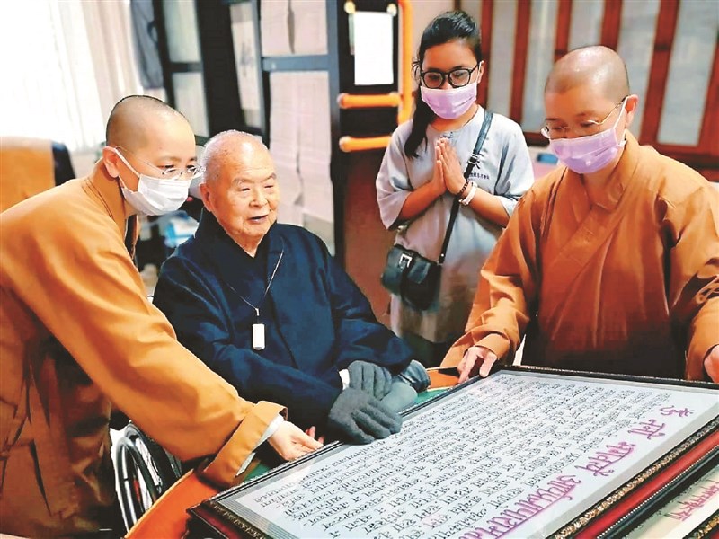 2019年,正進(右二)將自己手抄的梵文《心經》供養敬愛的師公。圖/正進提供