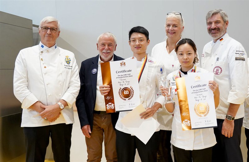 滕民猷(左3)、林芃儀(右2)26日代表台灣參加慕尼黑世界點心大賽,拿下第3名。圖/蔡育豪提供