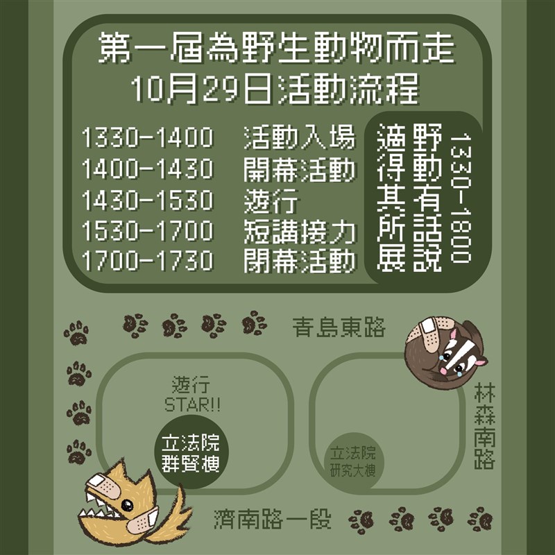 【本報台北訊】「2023為野⽣動物⽽⾛」10月29日⽴法院前濟南路登場,活動倡議為「野⽣動物正告急,⽝貓有家不遊蕩」,提出三項具體措施,呼籲政府與各政黨,落實「精進源頭管理」、「採取有效措施以減少遊蕩⽝貓」、「強化民眾保育與動物福利觀念」。