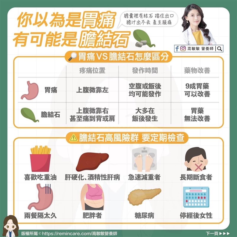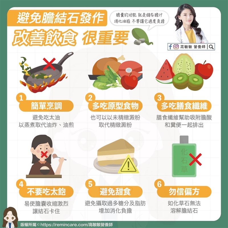 預防膽結石 飲食調整6撇步 陳玲芳 |2023.10.29 語音朗讀 2658觀看次 字級 大 中 小 簡單烹調、避免吃太油,多吃原型食物、膳食纖維,讓膳食纖維幫助吸附膽酸,都是預防膽結石的好方法。圖/pexels 【記者陳玲芳台北報導】膽囊是人體內消化器官之一,肝臟分泌的膽汁會先儲存在膽囊內,而「膽結石」的成因,主要與膽固醇增加,或總膽酸的貯存量減少有關,使膽汁逐漸結成一粒粒小石狀的結晶。預防之道,營養師提出飲食調整6撇步。奇美醫院營養科指出,當食物進入十二指腸後,食物中的脂肪會刺激腸黏膜細胞釋放膽囊收縮素,刺激膽囊釋出膽汁,來幫助脂肪消化吸收,所以如果缺乏膽汁,脂肪吸收就會出現障礙。膽結石會嵌在膽囊頸部,膽管或腸管內而引發疼痛,甚至引起膽囊穿孔或積膿,使附近器官如肝、胃、脾臟等發生膿瘍、發炎、穿孔等病變,嚴重時還可能有生命危險。圖/營養師高敏敏提供膽結石3大元凶造成膽結石的可能原因歸納如下:1. 肥胖:肥胖者的膽汁膽固醇飽和度比非肥胖者高,因而容易造成結石。2.高熱量、高膽固醇、高油脂飲食:高熱量和高膽固醇、高油脂飲食都會增加膽囊收縮素的刺激,使膽囊的工作量增加,進而增加膽囊結石的可能。3. 精製糖攝取過多及低纖維飲食:低纖維飲食會改變改變腸道菌叢,因而刺激膽汁膽固醇的分泌。營養師高敏敏表示,最近身邊有人從一開始以為的「胃痛」到「膽結石」開刀取膽、進而成為「無膽者」。其實,膽結石是接近「無聲」的疾病,除非痛到去看醫生,否則多數人應該一輩子都不知道自己有膽結石。圖/營養師高敏敏提供高敏敏提醒,由於「膽囊」主要功用就是儲存膽汁,幫助消化油脂,所以不要讓「它」過度負擔,透過飲食調理6原則,可減少膽結石發生與發作的機會。飲食調整6撇步1.簡單烹調:避免吃太油,以蒸煮取代油炸、油煎。2.多吃原型食物:也可以用部分未精緻澱粉,取代精緻澱粉。3.多吃膳食纖維:膳食纖維可幫助吸附膽酸,再和糞便一起排出。4.不要吃太飽:易使膽囊收縮激烈,讓結石卡住。兩餐之間,也不要間隔太久,膽囊太久沒有收縮,容易膽汁堆積、造成結石。預防膽結石,應避免甜食,因為攝取過多糖分及脂肪,會增加消化負擔。圖/pexels5.避免甜食:避免攝取過多糖分及脂肪,增加消化負擔。6.勿備偏方:如「化石草」也無法溶解膽結石,因為膽結石形成後通常是「不可逆」,唯有透過飲食調整,方能減少發作。當嚴重發作時,大多要切除膽囊,切莫錯過治療的黃金期。她強調,膽結石不可怕,可怕的是大家不知善待身體。建議每年定期做一次腹部超音波檢查,若有莫名腹痛、胃痛、吃胃藥仍未好轉時,應及早尋求專業醫師診斷。 前一篇文章 逾3萬人同步開跑 長庚永慶盃跑了14年 下一篇文章 病主法4周年 助逾千名弱勢者預立醫囑 熱門新聞 01【詩】草螟公2025.12.1802與精品品牌撞鞋 印度涼鞋打專利戰2025.12.2103福建艦航經台海 空拍照首曝光2025.12.1804資助流浪漢之家 里斯本佛光人跨文化送暖2025.12.1805多倫多佛光山龍獅團 中華文化薪火相傳2025.12.1806佛光山高雄佛教堂 營建工地評鑑特優2025.12.1907【時光重逢】花宅海邊美術館2025.12.1908邂逅佛教 安頓身心2025.12.2109北島佛光山獲四星肯定 園林躍升具重要意義庭園2025.12.1910太陽瓶燈泡 點亮貧困家庭希望 2025.12.19 訂閱電子報 台北市 天氣預報 台灣一週天氣預報 相關報導 單車隊環台送暖 救助急難家庭 多走少坐隔天心情好 比高強度運動更有效乳牙蛀掉沒差? 醫:未來恐臉歪嘴斜冬至養生回陽氣 蔬食溫補順節律少坐、多動 隔天心情會更好睡覺房間宜保持全黑 有光線身體無法放鬆 作者其他文章單車隊環台送暖 救助急難家庭 從誤解到和好 兒童情緒的修復之旅冬至養生回陽氣 蔬食溫補順節律少坐、多動 隔天心情會更好每年定期檢查降失明風險 近3分之2糖友 陷視力危機刷牙清潔不到位 恐釀牙周病