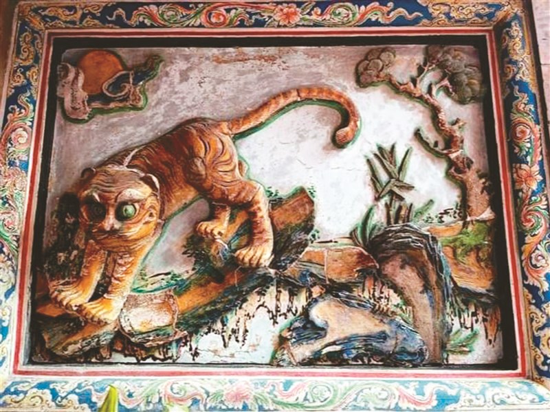 雕刻有龍身及海浪的正殿御路。圖/黃筱婷 虎形交趾陶,北派宗匠洪坤福作品。圖/黃筱婷