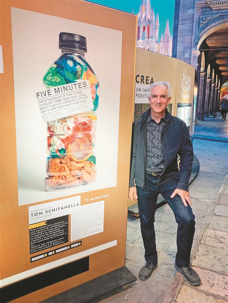 席法內拉出席《國家地理》雜誌「行星還是塑膠?」國際攝影展發表會,站在自己的作品旁邊。圖/取自FB@Tom Schifanella