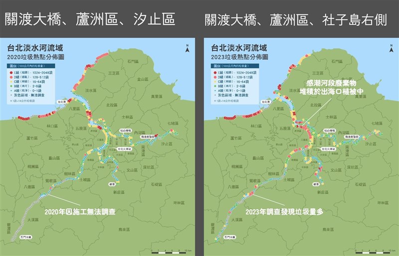 針對關渡大橋、蘆洲區蟬聯垃圾集中熱點,新北市環保局簡任技正許銘志表示,雖然平時有維護清理,但因蘆洲至關渡大橋為感潮段,甚至還有紅樹林,垃圾一旦卡進去就很難出來,就算投入很多資源清理,仍會成為熱點,因此除了清運,還要源頭減量。