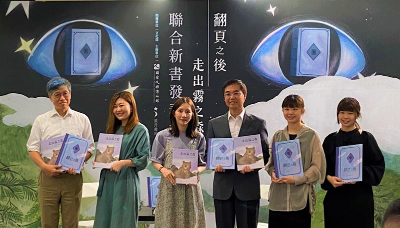 人權館出版人權繪本《走出霧之森》、《翻頁之後》,今舉行新書發表會,圖為台灣大學台文所教授蘇碩斌(左起、《走出霧之森》作者蔡旻螢、許楚妘、人權館館長洪世芳、《翻頁之後》作者沈芳安、沈芳因。圖/人權館提供