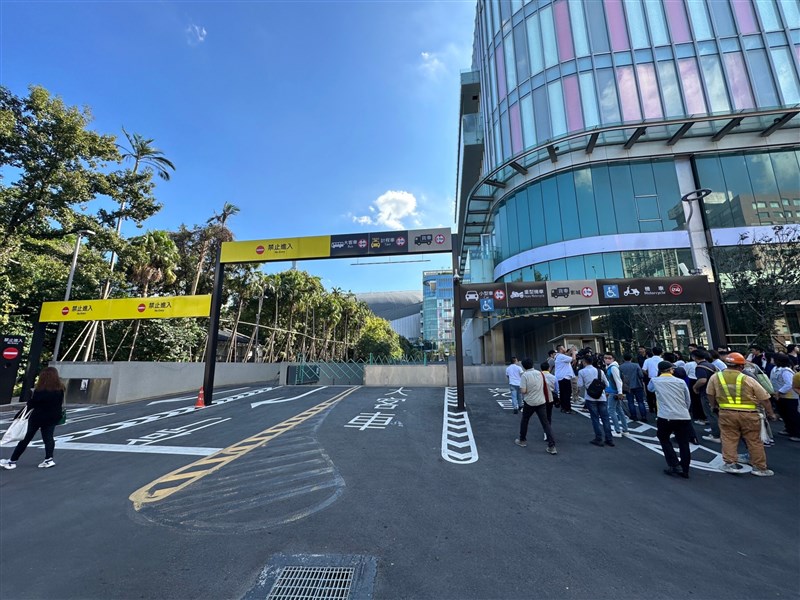 台北市議會交通委員會2日赴大巨蛋考察,議員指交通設施仍有多項缺失,包含大小客車進停車場出入口動線交會、大客車臨停區需預約等。圖為近菸廠路停車場出入口。圖/中央社