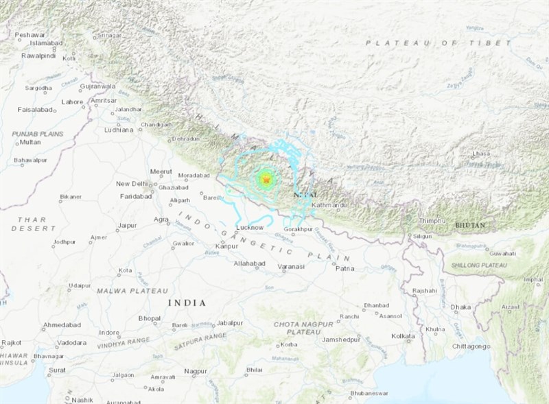 尼泊爾西部賈賈科特地區3日深夜發生強震,連遠至印度的新德里都可以感受到搖晃。圖/取自美國地質調查所網頁