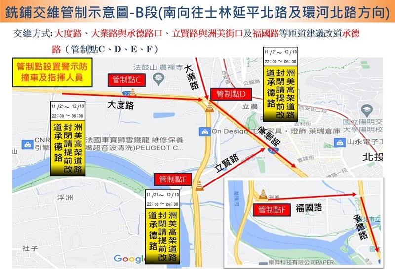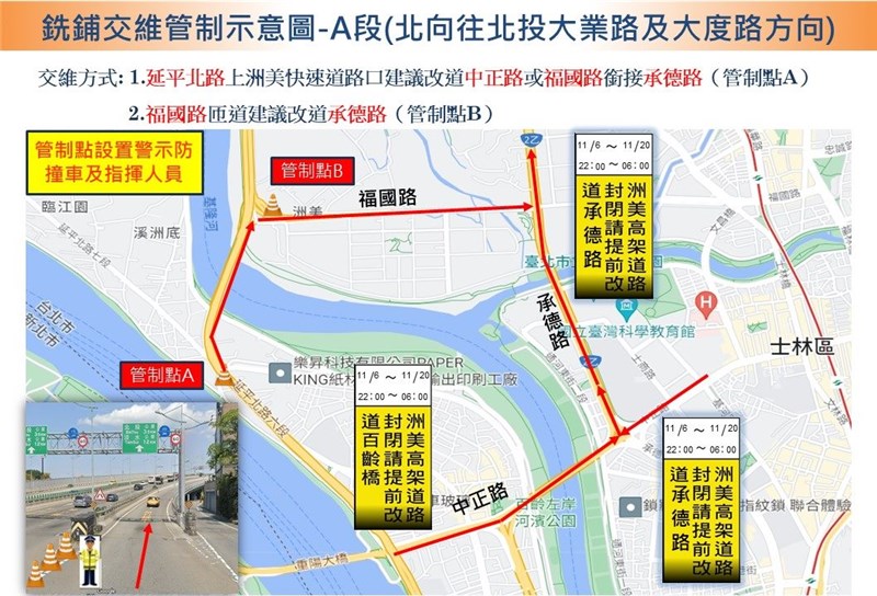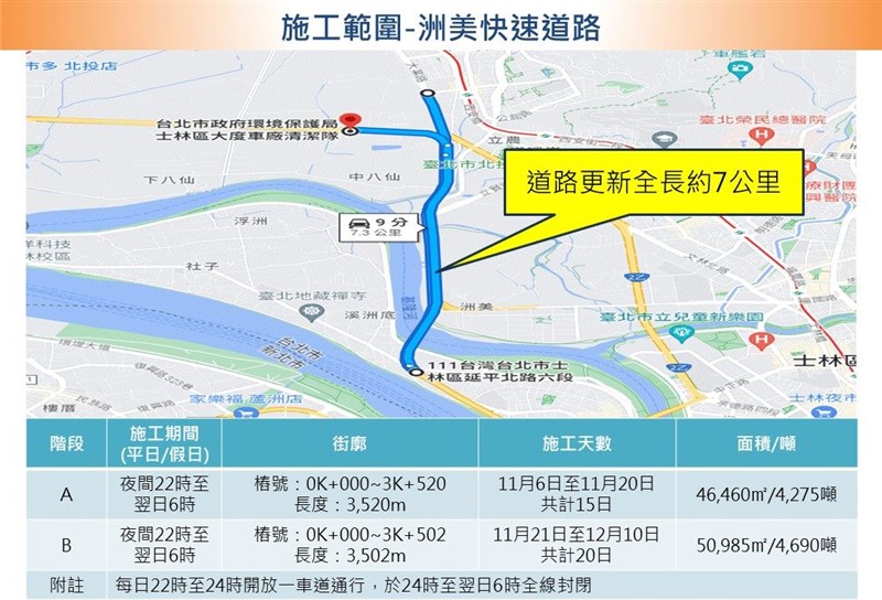 洲美快速道路路面更新 11/6至12/10分段夜間施工 |2023.11.05 語音朗讀 587觀看次 字級 大 中 小 圖/台北市新工處提供 【本報台北訊】台北市新工處今(5)日表示,配合洲美快速道路路面更新工程,11月6日至12月10日分段夜間封閉相關道路施工,施工路段分A段北向、B段南向,施工期間將全線封閉,呼籲用路人注意。北市府新建工程處發布新聞資料指出,洲美快速道路北起大度路及大業路,南至延平北路接環河北路及重陽橋,為新北市淡水區及台北市北投、士林區進市中心的重要幹道,因大量車流頻繁往返造成路面多處老化龜裂及破損。新工處表示,為確保駕駛通行安全性及舒適度,經檢討後把洲美快速道路列入今年度計畫更新路段,考量龐大車流因素,規畫車流量最小的夜間交通離峰時段分段施工,施工期間車道全面封閉。新工處指出,洲美快速道路路面更新工程期間,各入口匝道前將設改道指示牌面,實施交管時間會派駐指揮人員引導駕駛改道,呼籲駕駛多留意指示牌面,依現場指揮人員指示改道通行,維護車輛行駛安全。圖/台北市新工處提供洲美快速道路路面更新長度約7公里、寬度13公尺,預計11月6日至12月10日(遇雨順延),利用夜間10時至隔天凌晨6時施工,施工路段分A段為北向往北投大業路及大度路方向、B段為南向往士林延平北路及環河北路方向。新工處表示,A段北向往北投大業路及大度路方向,11月6日至20日晚間10時前,開放延平北路上洲美快速道路1車道通行,其餘福國路匝道封閉;深夜0時全線封閉,僅開放往福國路車道,建議提前改道中正路接百齡橋,或改由福國路銜接承德路。B段南向往士林延平北路及環河北路方向,11月21日至12月10日晚間10時前,開放大度路上洲美快速道路1車道通行,其餘大業路與承德路口、立賢路與洲美街口及福國路等匝道封閉,深夜0時全線封閉,建議提前改道承德路行駛。新工處指出,如提前完成施工作業將縮短交管措施,施工期間讓用路人不便,請市民體諒,會以嚴謹態度盡早完工,提供市民安全舒適及平坦道路。圖/台北市新工處提供 前一篇文章 各地晴朗穩定 日夜溫差大 下一篇文章 穿山甲的棲地 高雄市推泥岩惡地生態遊程 熱門新聞 01銀杏點亮.東京印象2025.12.2302北捷英雄捨身救人 母盼菩薩接引2025.12.2303【守護家人】 為愛築家2025.12.2304降噪耳機原理2025.12.2205數位科技與信仰交會 推播人間佛教文化2025.12.2206【獻給動物朋友的詩】 最可愛的動物詩路2025.12.2507以法相聚 佛光山員義工歲末聯誼2025.12.2408冬季騎遇 大鵬灣蔬旅2025.12.2209全球首創 二氧化碳發電機2025.12.2210社論--悲憐天下父母心2025.12.25 訂閱電子報 台北市 天氣預報 台灣一週天氣預報 相關報導 今年最後一波冷氣團來襲 明天起回暖碧砂漁港 打造全台最大遊艇碼頭雪山三六九山莊重建 尋求調解藍白推未來帳戶 拚立院本會期審議 淡水河畔 初冬小花海台東昨6.1地震 氣象署:恐有餘震