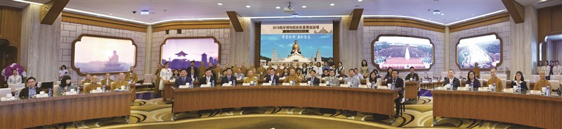 2016年4月,「兩岸博物館新能量價值論壇」在佛光山佛陀紀念館展開,星雲大師(中)於開幕式中為眾人開示、歡喜合影。 圖/如輝
