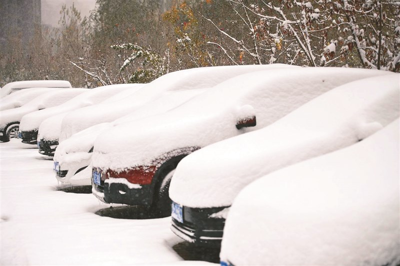 中國大陸遼寧省降下大雪,多輛汽車6日被積雪覆蓋。圖/法新社