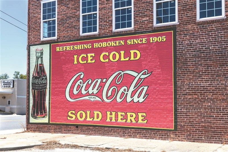 美國喬治亞州霍博肯的舊版可口可樂廣告壁畫,可以看到商標字樣鑲嵌在靠近中央的C字尾部。