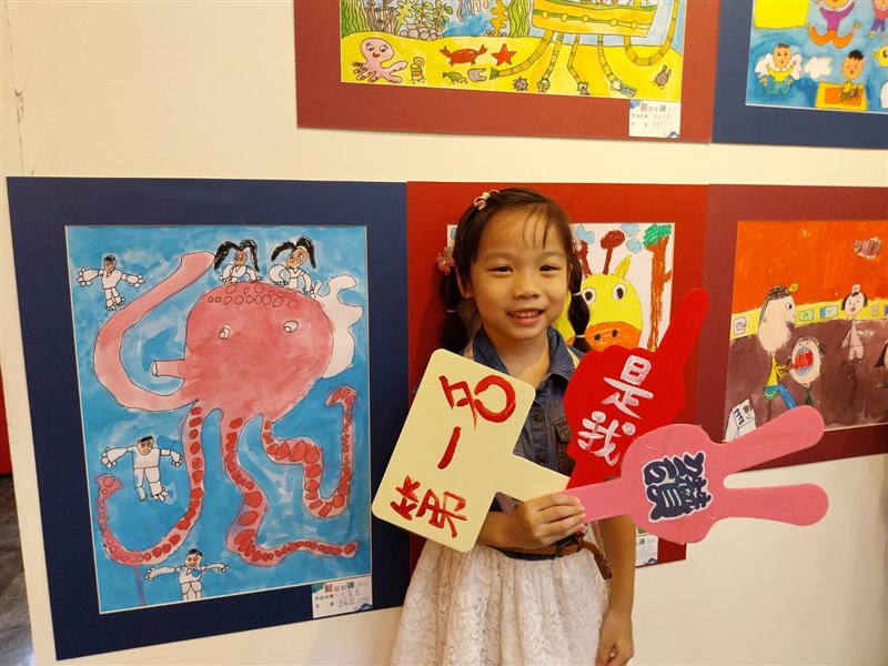 李采恩是繪畫班年紀最小的,今年才5歲,可愛的萌妹是班上的開心果,不過她卻有豐富的想像力和創作力。李采恩一幅悠游大海的八爪章魚用色大膽、活潑有趣令人驚豔。「我覺得海裏面的章魚有好多隻長長的大腳,軟軟的彎來彎去的好神奇!」
